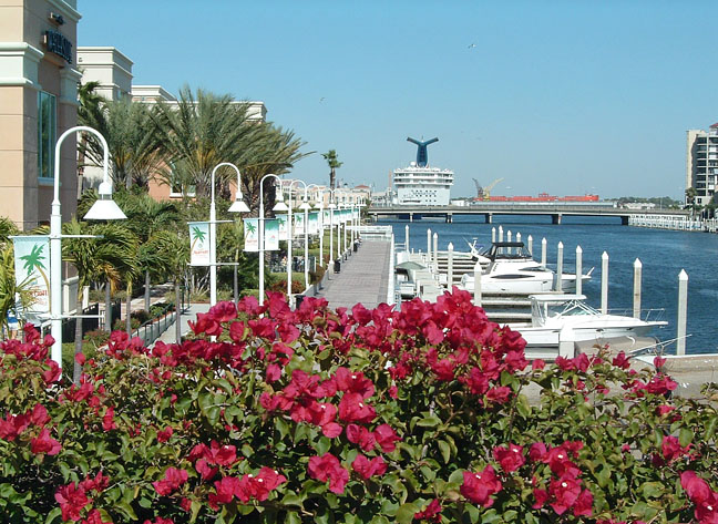 Flowers along the east side of the Harbour Island Blvd. bridge create the foreground for this scene looking