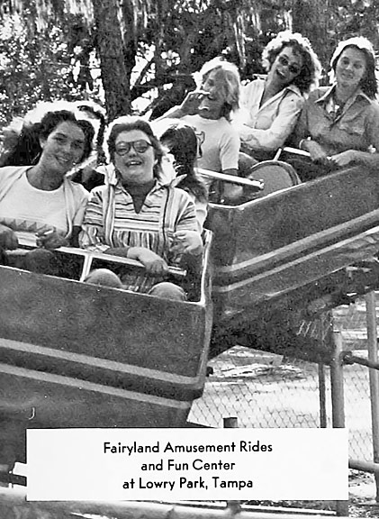 The Rainbow Bridge adorned the main entrance to Fairyland at Lowry Park. To us as kids, it meant we were finally at the park and a fun time was not long in coming. The staircase extending backward from the top of the rainbow led to the entrance of Fairyland. Once inside, in addition to the recreated nursery rhymes and fairy tales, a miniature railroad wound through Fairyland and its fascinating game reserve. From the open cars, you could see wild animals moving about freely over the park area. The trip also featured a mock African village complete with thatched houses and tree huts. Fairyland also included an amusement park with games and rides, and a playground. Fairyland was drawn from the dreams and hopes of childhood. Peter Pan lived again, as life-sized pixies drifted through trees over a landscaped path winding through the 15 acres of the park. Live mice helped complete the restoration of the familiar "Hickory Dickory Dock." One could see the Old Lady living in a shoe that was 20 feet high. Humpty Dumpty was perched on the castle wall and all the King's men were standing by as he teetered on the edge. Across the lane was the home of the Little Red Hen and nearby, the Three Men in a Tub--the butcher, the baker and the candlestick maker--floating in a sea filled with goldfish. Live woolly lambs frolicked in the yard in front of Mary's Little Red Schoolhouse. Peter Rabbit lived with his family in a stump under toadstools four feet high while Little Miss Muffet watched from her tuffet as a big spider tried to frighten her away. On the drawbridge to the Castle, Goosey Gander stood guard while Rapunzel leaned out, hoping to be rescued. Enchanted youngsters could even stand in the mouth of Willie the Whale as they watched the antics of tropical fish. The efforts of the Three Little Pigs and their huff-puffing nemesis were there. Melodies of the nursery rhymes and other children's music were heard in all parts of the park through hidden speakers. Fairyland was widely acclaimed as one of the nation's finest free fantasyland amusement areas. |