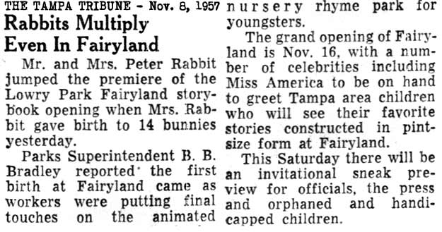 Before the park opened, the rabbits had already increased their population by fourteen. Tampa City Parks Supt. Buford Bradley reported it was the first birth at the children's theme park. It was planned to have Miss America, Miss Marilyn Van Derbur, attend the opening to greet the TAMPA AREA children. A pre-opening was scheduled for Nov. 9 for VIP's, the press and orphaned and handicapped children.