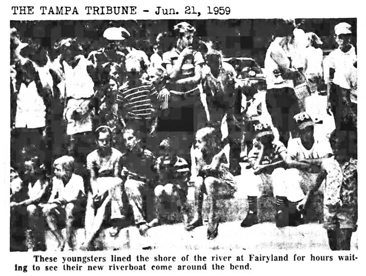 A year after Fairyland opened, the city considered a river boat ride that paddled around on a man-made river within the park. It appears that the deal was almost as good as done, but 7 months later a real riverboat attraction on the Hillsborough River was announced. By summer of 1959, it had been decided to use a Mississippi-style packet boat with churn wheel to give rides on the Hillsborough River. Large enough to hold 30 passengers, the maiden voyage from Davis Islands to Lowry Park took place on Jun. 20th at 10 a.m. with Mayor Nick Nuccio and a party of officials on board. A police boat escorted the boat to Fairyland where the mayor officially opened the new attraction.
