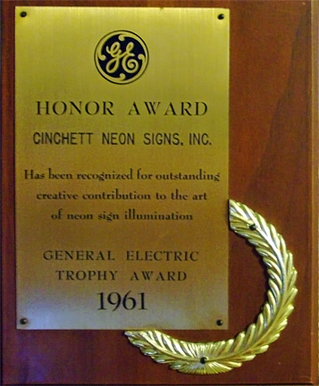 Cinchett Neon Signs, Inc. was awarded this national recognition by General Electric in honor of the completed sign. Contrary to what all of Tampa probably believed by 1959, Dr. Sumter Lowry (father of Gen. Sumter Lowry) did NOT donate the land that became Lowry Park, nor did any Lowry family member. It was purchased by the City in 1918 and dedicated with his Lowry's name in 1925. Proof is in this feature. Photo provided by Johnny V. Cinchett |