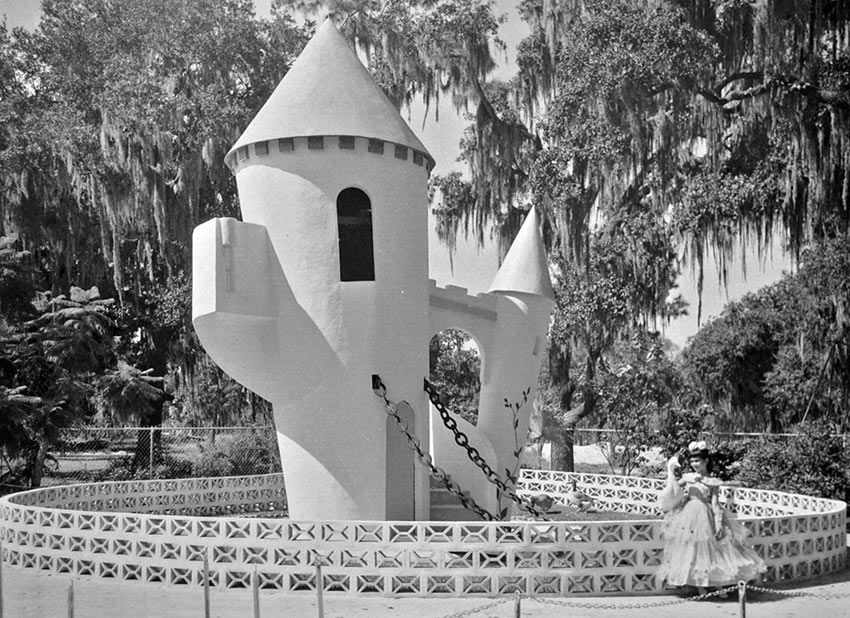 Children at storybook setting, Rupunzel's castle, with Willie the Whale in background, Fairyland at Lowry Park, Nov 21, 1957. Photo courtesy of the Burgert Brothers collection at the Tampa-Hillsborough County Public Library. |