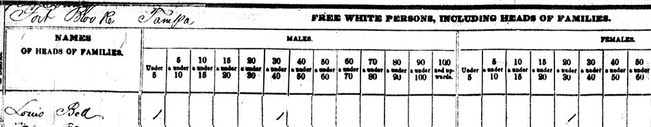 The petitioners urged that the Senate vest the land in the town of Tampa for use as a "park or public pleasure ground for the recreation of the inhabitants." LOUIS BELL, AN EARLY TAMPA PIONEER FROM CANADA In 1883, the second petition asked that Louis Bell be allowed to retain his home in the event that the land was sold. Bell, about eighty years old and a veteran of the Mexican and Seminole Wars, earned a "scanty subsistence" from his garden and had lived on the reservation land for years. Bell came to Fort Brooke sometime between the 1830 and 1840 censuses.