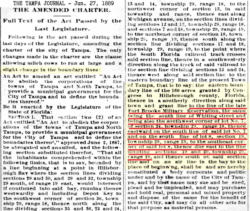THE HACKLEYS REENTER THE DISPUTE Below from: Lewis, Jeffrey (1982) "How Tampa Lost the Fort Brooke Military Reservation" USF Library Digital Collections Ex Libris 5, Summer 1982. Two more important claimants emerged to compound the confusion. In September 1887, the heirs of Robert J. Hackley, the settler thrown off the site by Col. Brooke 63 years before, claimed the right of preemption and purchase. They argued that Hackley was guaranteed this right by an act of Congress in 1826, and upon his death it was transferred to them. THE AMENDED CHARTER CHANGES TAMPA'S INCORPORATE LIMITS, BUT DID IT REALLY CHANGE RIGHTS TO FORT BROOKE LAND? Jeffrey Lewis, in "How Tampa Lost the Fort Brooke Military Reservation, states that in 1889 an act of the State Legislature created the new City of Tampa and extended its incorporate limits to cover the reservation. On this basis the city maintained that it was entitled to the lands for use as a public park. Below, the amended charter passed on June 5, 1889, was presented in the Tampa Journal of Jun. 27th. The article states that there was only "a slight change in the boundary lines."