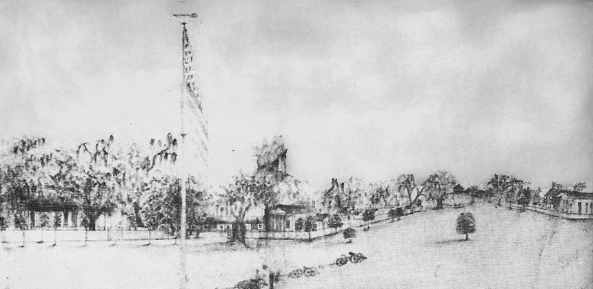 General view of Fort Brooke and parade grounds 1845, by Juliet Lay Axtell Thanks to the artistic talents of Juliet Lay Axtell, one of the Army Chaplain Axtell's daughters, who at the age of 12 sketched this view of Fort Brooke. At the time, the garrison consisted of 20 whitewashed buildings with Col. Wm. G. Belknap in command. The large building at the left of the flagpole was the commanding officer's headquarters. The small buildings to the right at a distance were the soldiers' quarters. The line of buildings from the Adjutant's office to the Indian mound was known as "Bachelor's Row" because the buildings were occupied by unmarried officers of the post. The mound with the Chinese pavilion on its crest and encircled by a fence appears to the right of the large oak tree. The Captain's quarters and the post chapel are at the right. The flagpole and cannons mark the parade grounds where the mounting of the guards were held every morning and the site of many grand parades.