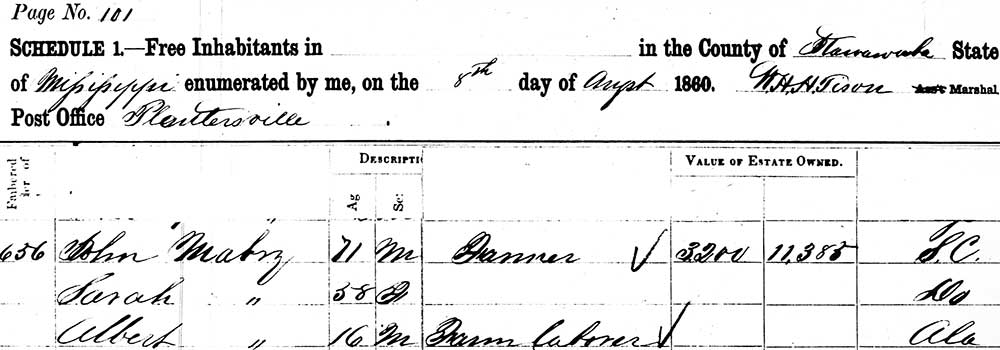 Mississippi. 1860 Census, Plantersville, Itawamba County, Mississippi Jesse's parents, John and Sarah, are on the 1860 Census of Itawamaba County, Miss. The record shows John Mabry was 71, a farmer, with $3,200 in Real Estate and 11,385 in personal property, again, considerably more than others on the page. Sarah was 58, giving her a calculated birth year of abt. 1801. Albert was probably their youngest son Elbert who appeared on their 1850 Census.