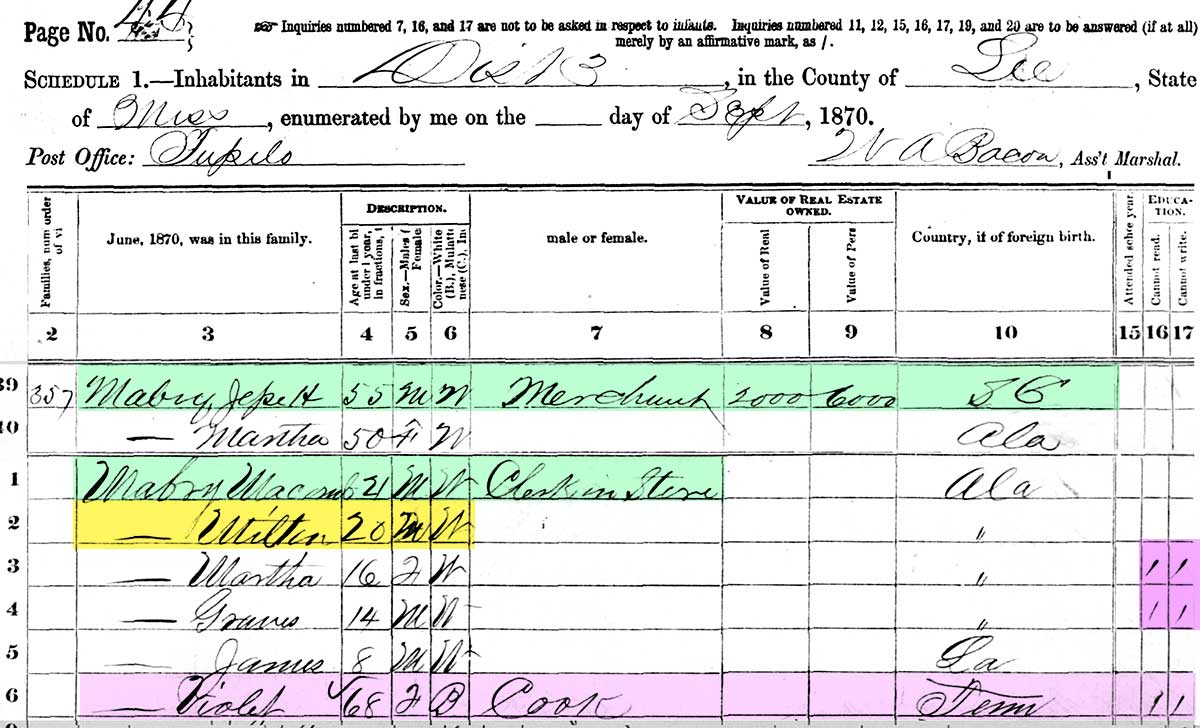1870 CENSUS, Tupelo, Lee Co., Miss. Jesse was listed as a merchant with $2,000 worth of real estate and & $6,000 worth of personal property. This was considerably more than others on this page. Malcolm was a clerk in a store, probably his father's. Milton was 20 and the Mabry's had a 68 year old cook named Violet, which indicates they were doing quite well.