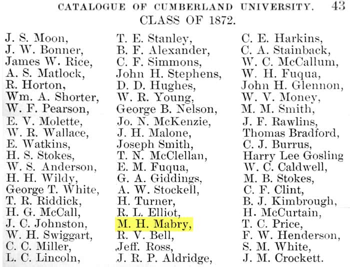 MILTON MABRY'S EDUCATION and MARRIAGE Milton Mabry received his literary education at the University of Mississippi "Ole Miss" at Oxford, Miss. which is about 30 miles NNW of Tupelo. Graduating after two years, in 1869, he entered the law college at Cumberland University in Lebanon, Tenn. where he received his Bachelor of Laws in 1872. He was admitted to the bar in Mississippi that year and commenced his law practice at his home in Tupelo. In 1876 Milton married Ella Dale Bramlett in Lee County, Miss. She was a daughter of John Woodson Bramlett and Eliza G. Turner Bramlett).