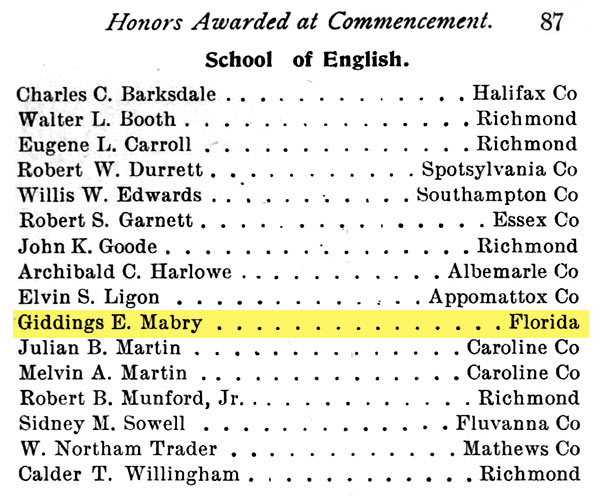 GIDDINGS MABRY'S EDUCATION Giddings Mabry was educated in the Leesburg public grade schools and Leon County High School in Tallahassee. In 1894 he entered the West Florida Seminary in Tallahassee until 1896.