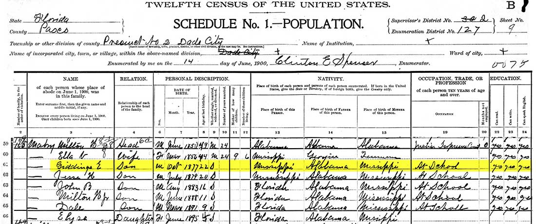 GIDDINGS MABRY RETURNS TO FLORIDA 1900 CENSUS, PASCO CO., DADE CITY