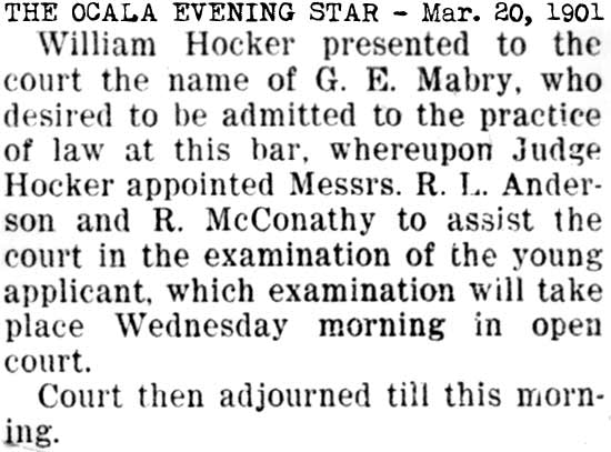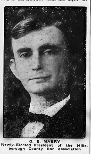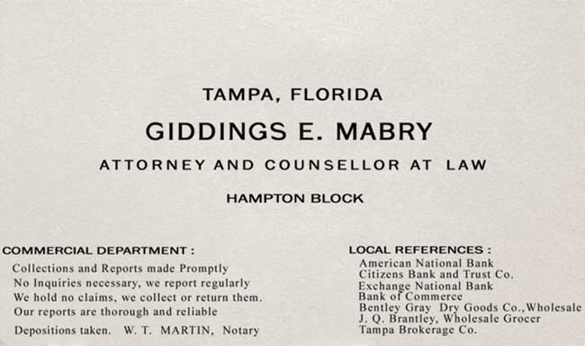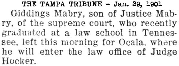 Giddings Mabry soon found himself being appointed frequently by Judge Graham to defend suspects in the criminal courts. 1901-10-18 The Tampa Tribune 1901-11-12 The Tampa Tribune In mid-February 1902, Giddings Mabry was admitted membership to the Hillsborough County Bar Association. 1902-02-09 The Tampa Tribune
