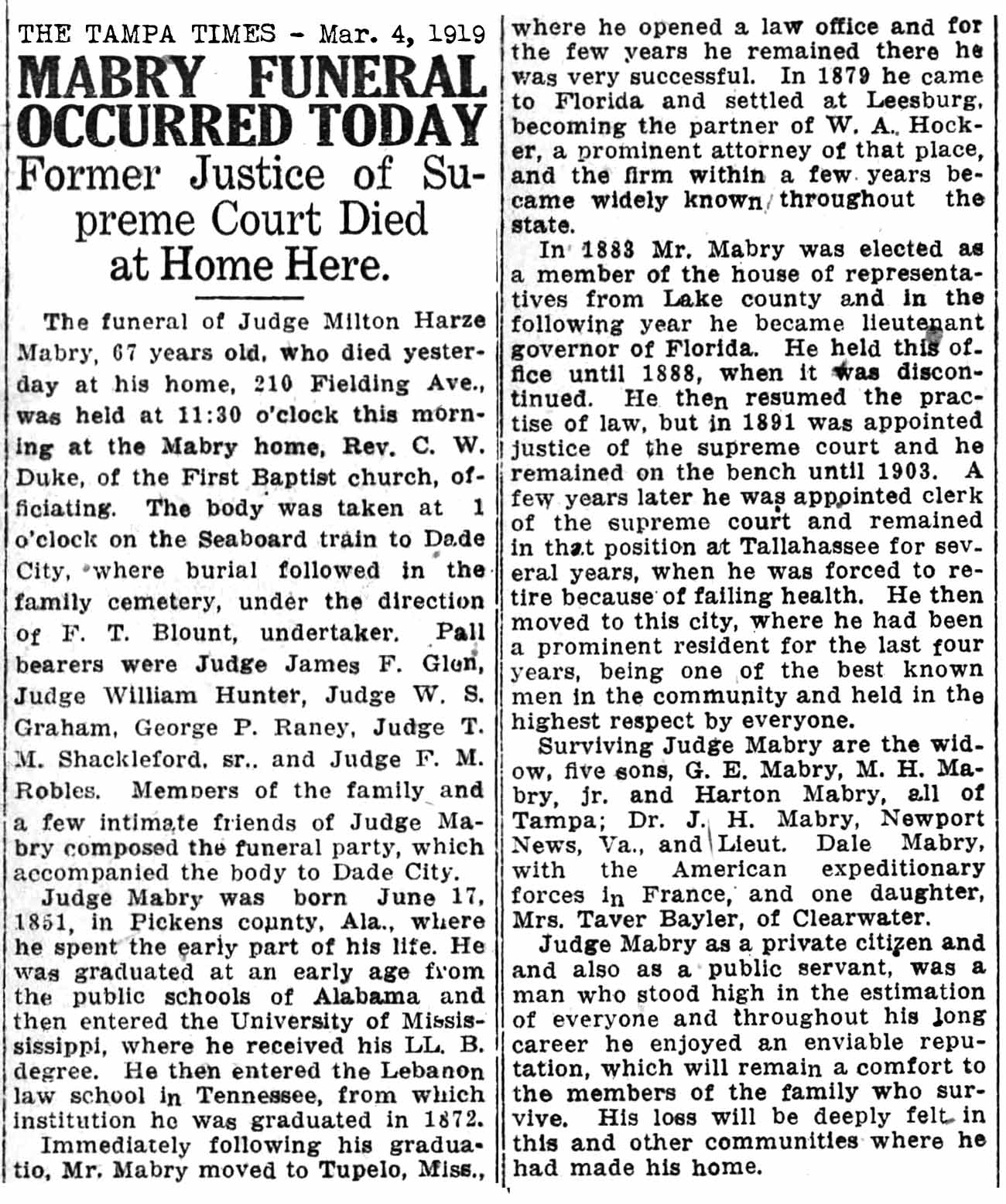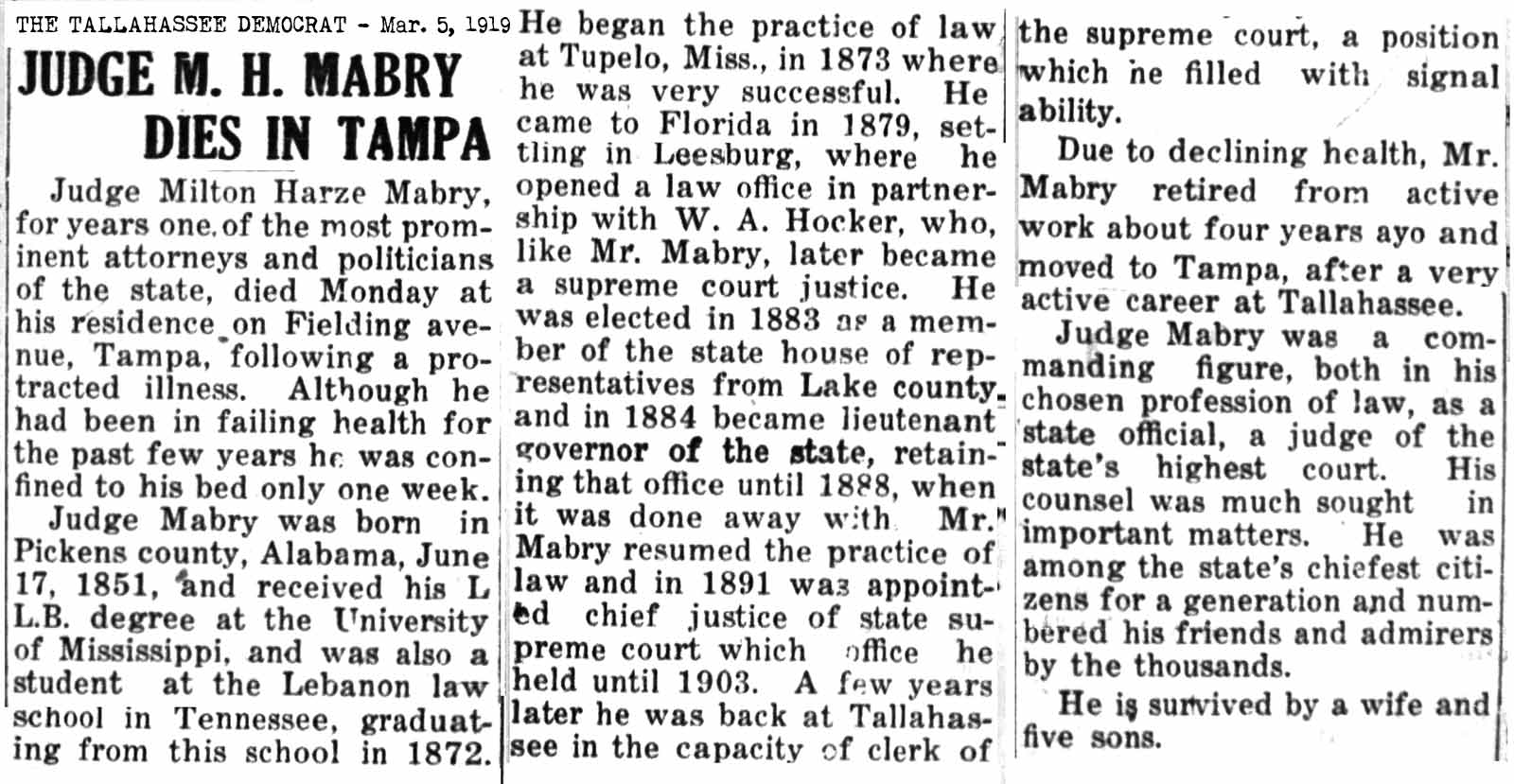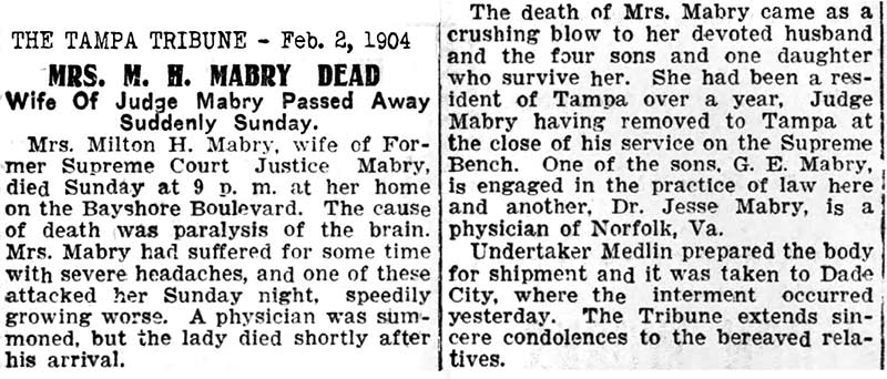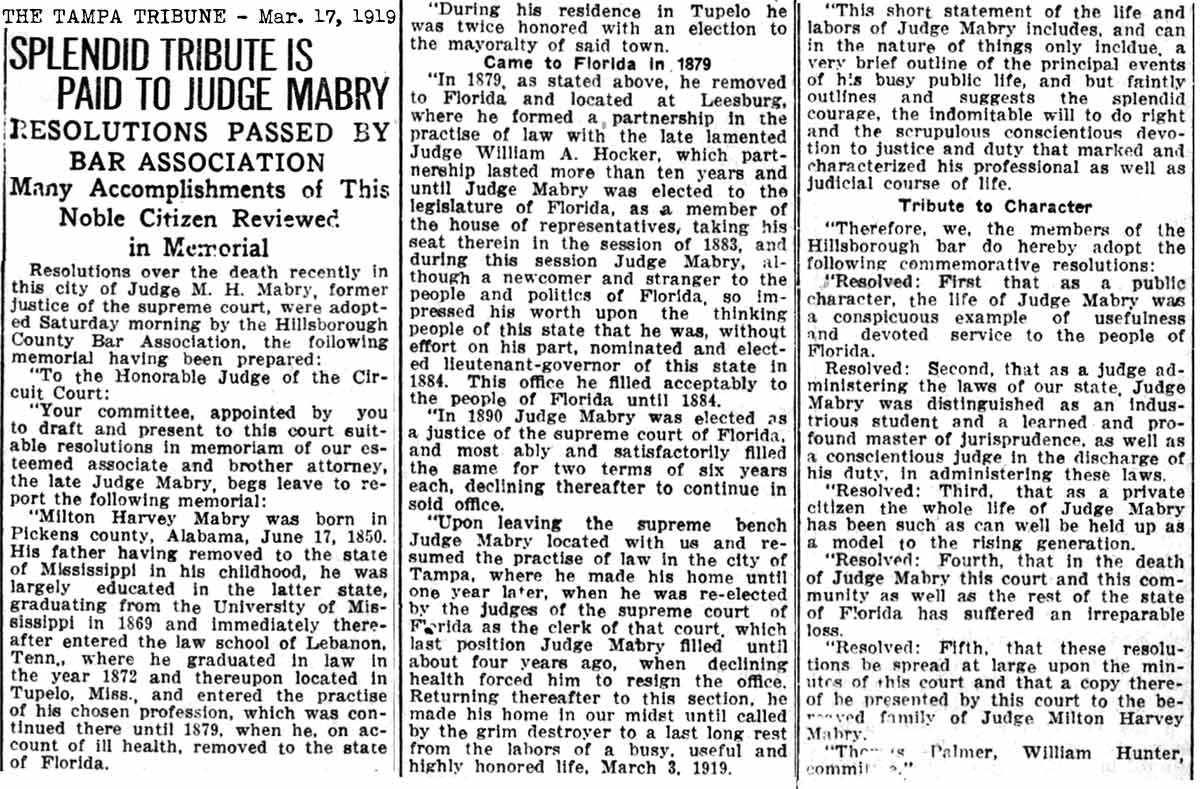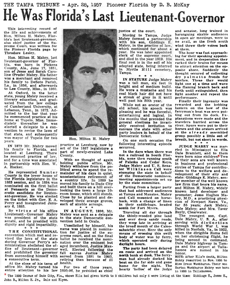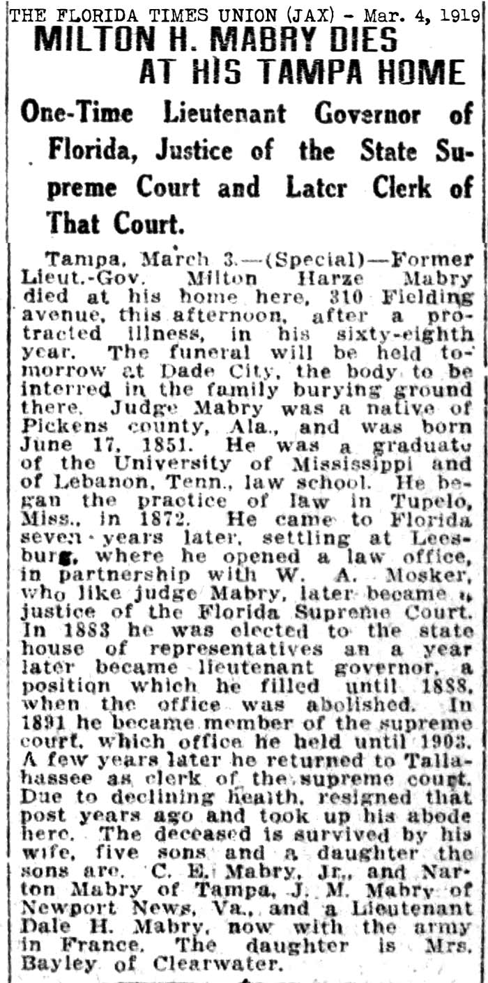 (Tallahassee) 1917-01-31 Tampa Tribune Death of Milton Harvey Mabry, Sr. 1919-03-03 Milton H. Mabry,