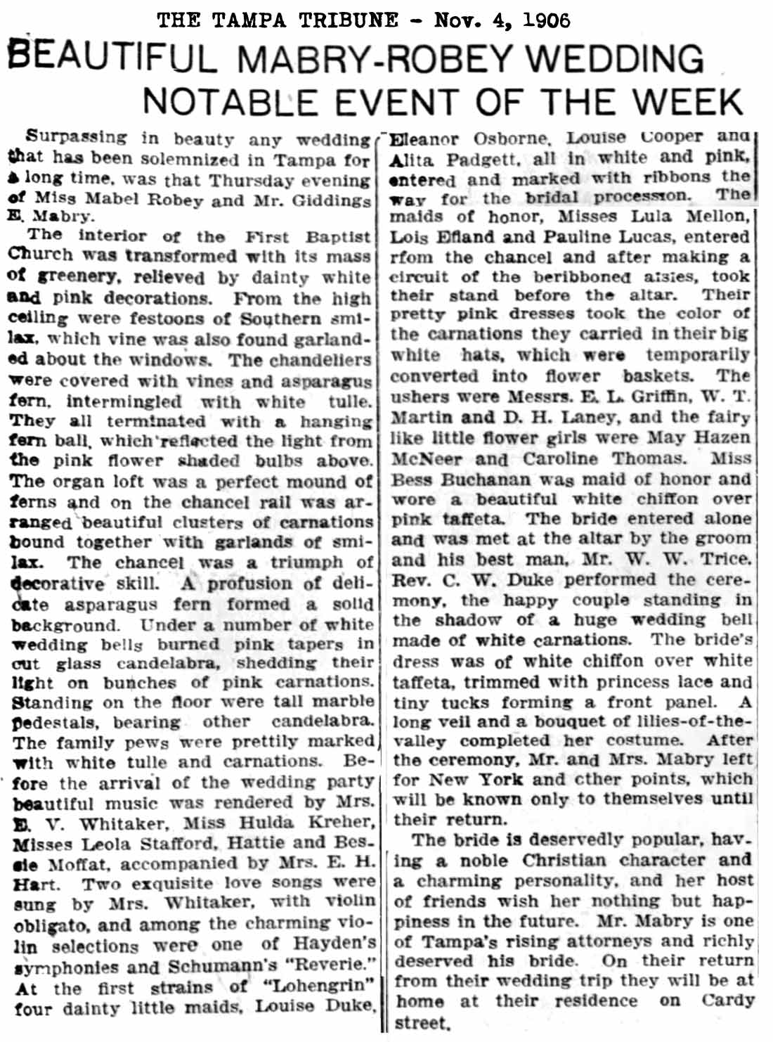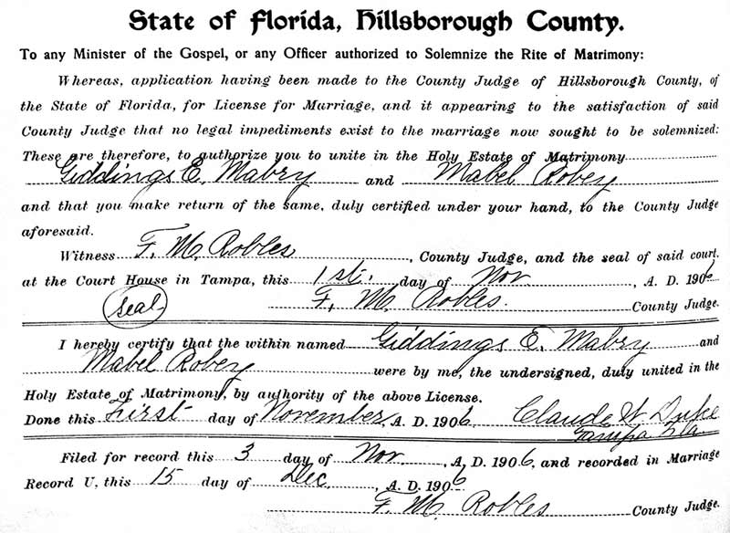 Read the whole article. 1906-10-07 The Tampa Tribune 1906-10-16 The Tampa Tribune On Nov. 1, 1906, Giddings married Iowa-born Miss Mabel Robey, a daughter of the Rev. George C. and Rebecca J. (Kelly) Robey.