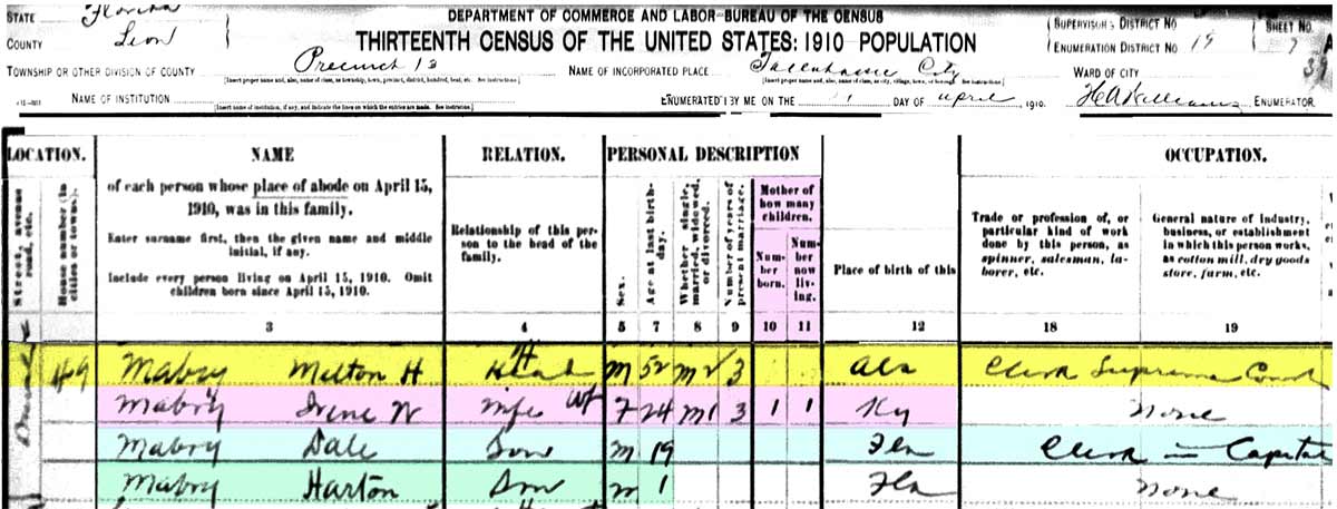 Union 1909-10-22 TRIB Death of John Bramlett Mabry 1910 Census, Leon County,