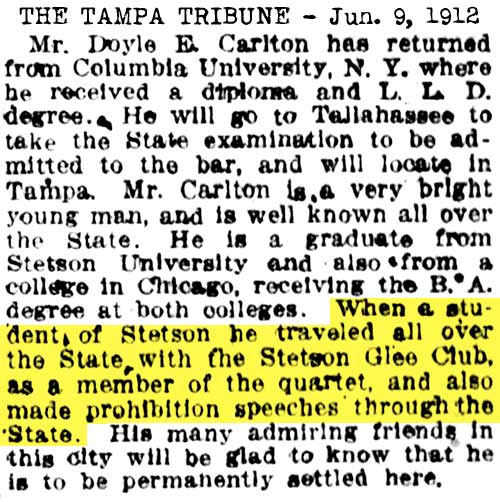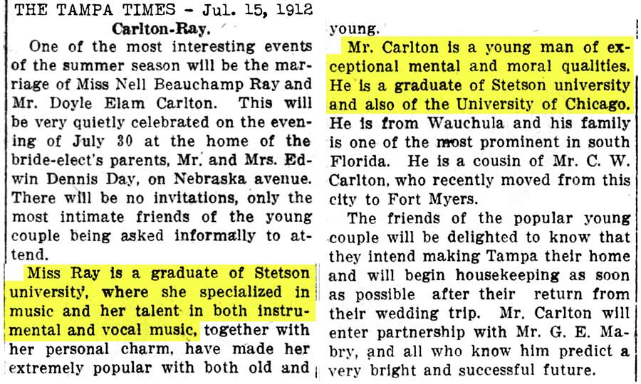 Carlton graduated from Stetson in 1909.