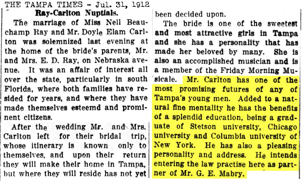 DOYLE ELAM CARLTON JOINS MABRY 1912-06-09 TRIB Doyle Carlton returns from Columbia University