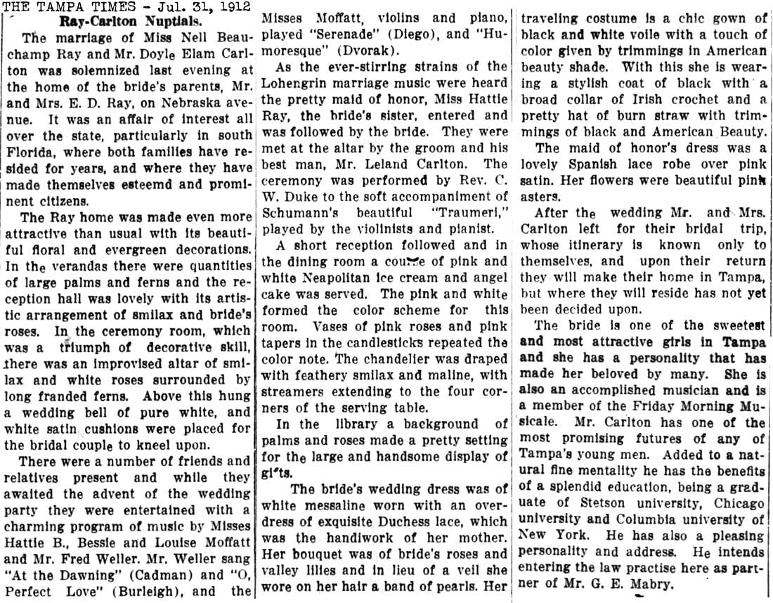 leaves for Tampa 1912-07-15 TIMES Carlton-Ray wedding announced