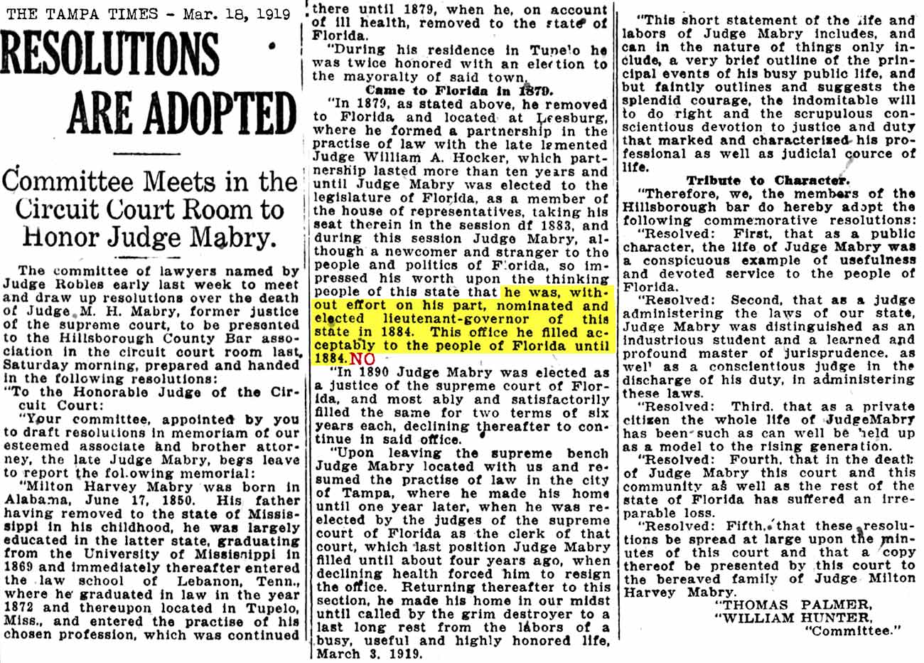 1890-07-01 Florida Times Union MABRY NOMINATED FOR SUPREME COURT JUSTICE 1890-08-13 Milton Mabry was sent as a delegate to the state Democratic convention in Ocala. Without solicitation as to himself, his name was placed in nomination for justice of the Supreme Court of Florida, and on the final ballot he received the nomination over eminent but aged incumbent, Justice Maxwell. (1957-04-28 The Tampa Tribune - "Pioneer Florida" by D. B. McKay, provided by Tampa historian Theodore Lesley.In August 1890 Mabry)