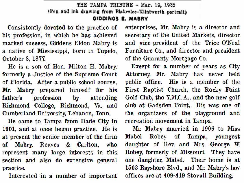 The April 1, 1910 Census in Tampa finds Giddings E. Mabry, living at 207 Cardy St. in Hyde Park, age 32, married for 3 years to 32 year old Mabel R. Mabry, Giddings's occupation was "lawyer, general practice" In their home was their 7 month old daughter, Mabel Mabry. Listed last is Bessie Brown, their cook, a 28 year old widow..