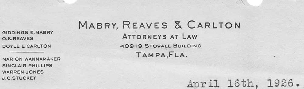 On Jan. 2, 1921, Mabry Reaves & Carlton moved into the brand new 7-story Stovall building at the southwest corner of Tampa St. and Madison.