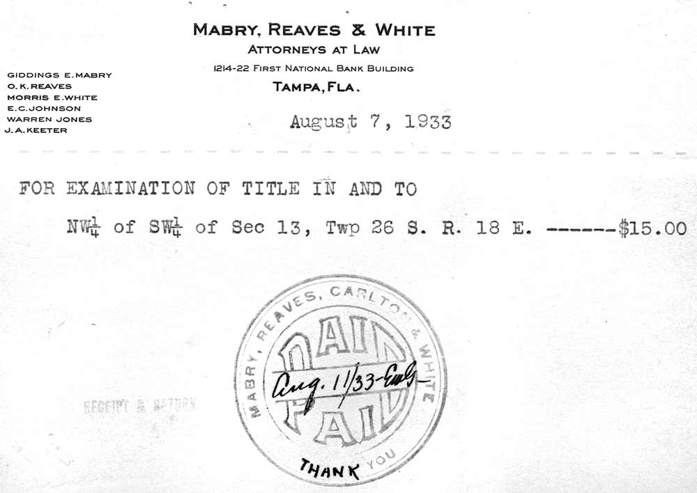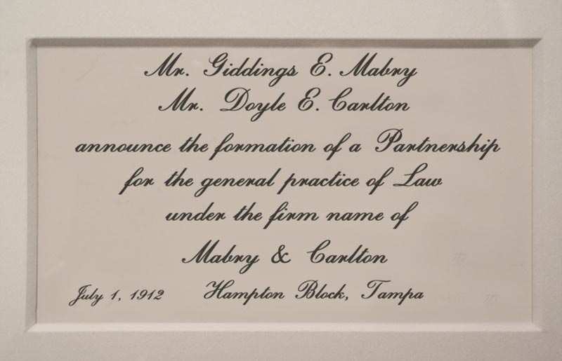 Around 1928 the law firm moved its offices into the new First National Bank Building at the corner of Franklin and Twiggs Streets, with the firm’s offices occupying the 12th floor of the building. The first National Bank changed its name in subsequent years to First Florida Bank and built another building one block west of the old building it occupied. “At that time the partners were G.E. Mabry, O.K. Reaves and Doyle E. Carlton. “In 1929 Carlton ran for Governor of Florida and was elected. He resigned from the firm while he served as Governor Morris E. White was brought into the firm in the Governor’s place and for the next few years the firm name was Mabry, Reaves & White. After Governor served his full term in Tallahassee, he returned to Tampa and was taken back into the firm. At that time (1933) the firm name became Mabry, Reaves, Carlton & White. “White left the firm in 1943