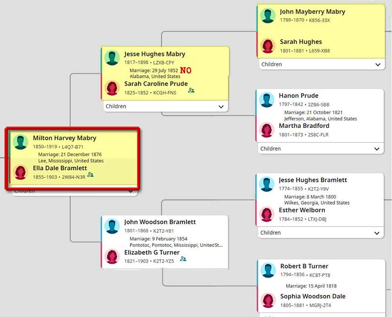1875-01-07 The Lee County (Miss.) Clarion 1876-12-21 MARRIAGE Milton Harvey Mabry married Ella Dale Bramlett on Dec. 21, 1876 in Lee County, Miss. (Ella was b.ca.1856, in Pontotoc, Miss., a daughter of John Woodson Bramlett and Eliza G. Turner Bramlett).