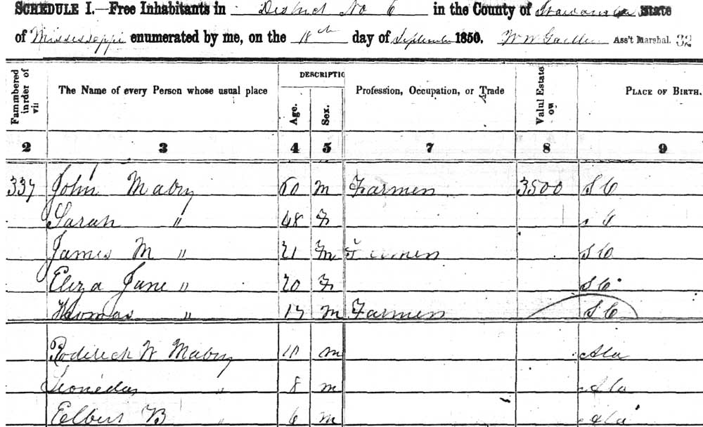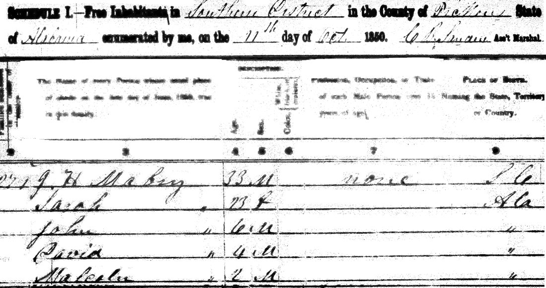 Their son, Jesse Mabry, is not in the home because he had married in Pickens Co., Alabama and was still living there in 1850
