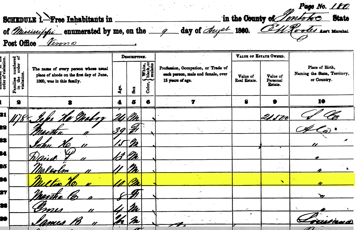 1870 CENSUS, Tupelo, Lee Co., Miss. Jesse was listed as a merchant with $2,000 worth of real estate and & $6,000 worth of personal property. This was considerably more than others on this page. Malcolm was a clerk in a store, probably his father's. Milton was 20 and the Mabry's had a 68 year old cook named Violet, which indicates they were doing quite well.