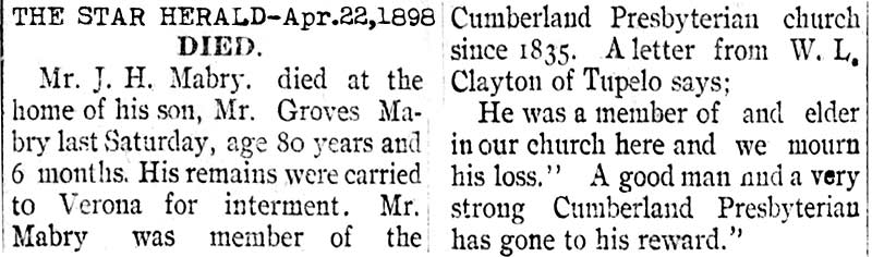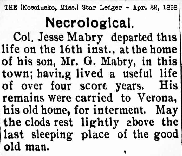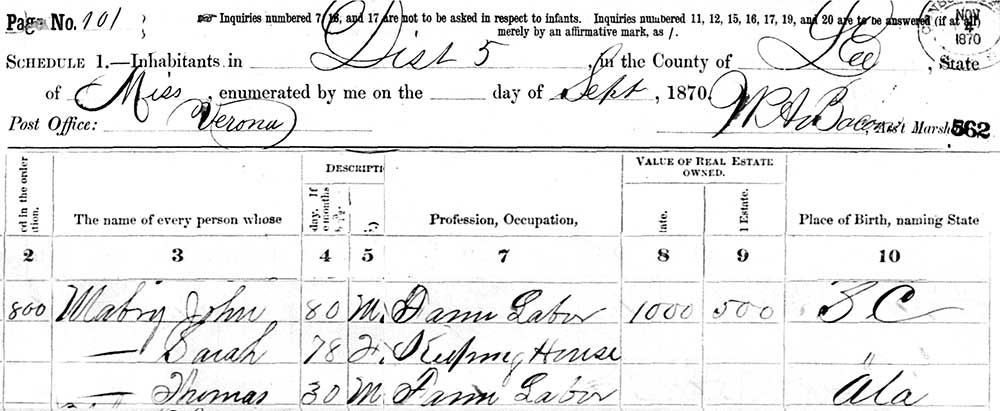 Jesse's father, John M. Mabry, died sometime after his 1870 Census in Itawamba County, Miss. where he last appears with his wife Sarah (Hughes) Mabry. John was listed at 80 years old, a farm laborer, with considerably less value in real estate and personal property. Sarah was listed as 78, but she was actually around 68 according to her prior censuses. As with his son Jesse, John probably didn't relocate, this is likely the area of Itawamba County that became Lee County in 1866. 1870 CENSUS, VERONA, ITAWAMBA CO., MISS.