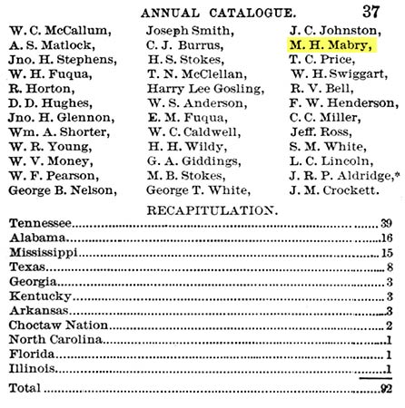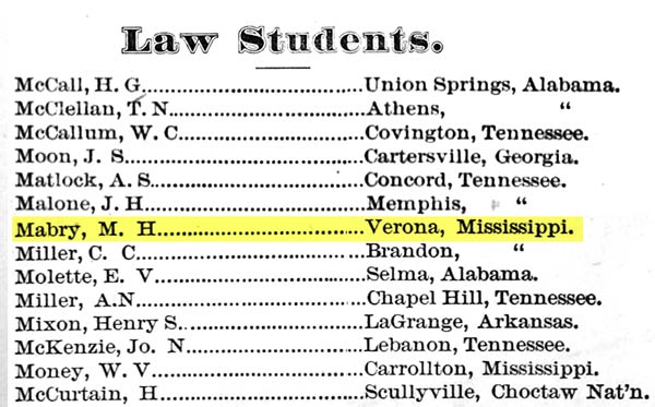 MILTON MABRY'S EDUCATION and MARRIAGE Milton Mabry received his literary education at the University of Mississippi "Ole Miss" at Oxford, Miss. which is about 30 miles NNW of Tupelo. Graduating after two years, in 1869, he entered the law college at Cumberland University in Lebanon, Tenn. where he received his Bachelor of Laws in 1872. He was admitted to the bar in Mississippi that year and commenced his law practice at his home in Tupelo. In 1876 Milton married Ella Dale Bramlett in Lee County, Miss. She was a daughter of John Woodson Bramlett and Eliza G. Turner Bramlett).