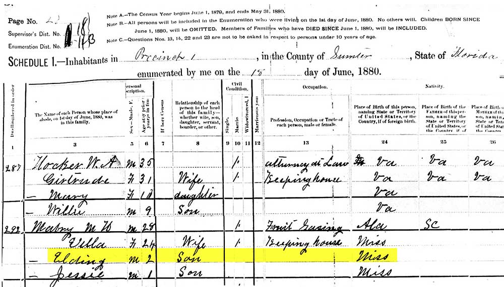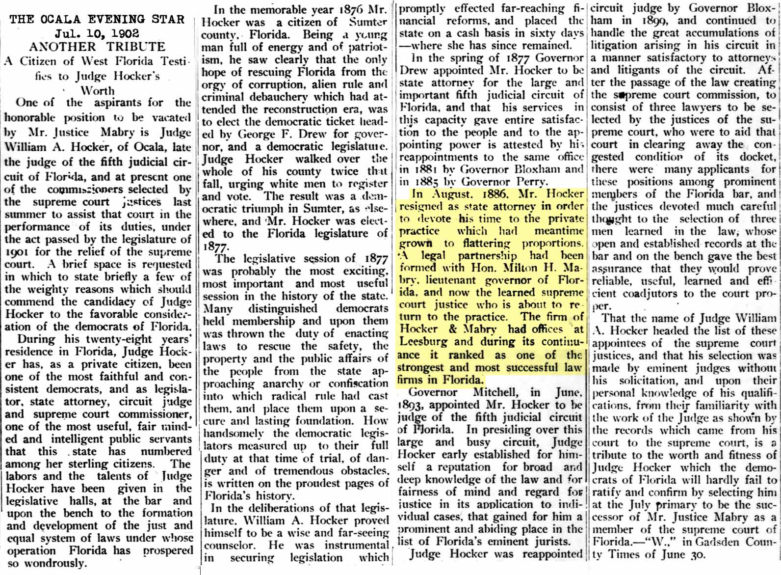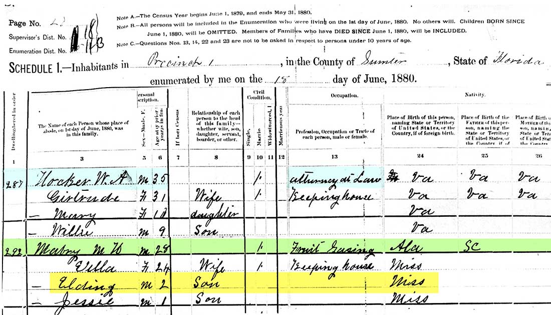 1880 CENSUS, SUMTER COUNTY, FLA. In 1879 Milton, Ella, and their sons Giddings Eldon Mabry and Jesse Hughes Mabry moved to Leesburg in Sumter Co, FL where Milton was in the practice of law and in the citrus industry. Milton was 28, his wife Ella Bramlett Mabry was 24. At the top of the page, five dwellings before the Mabry family, the Hocker family was enumerated. W. A. Hocker was 35, an attorney from Virginia. (The households in between have been removed.) Mabry would soon form a law partnership with W. A. Hocker.