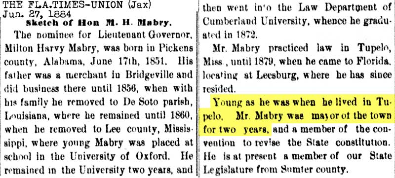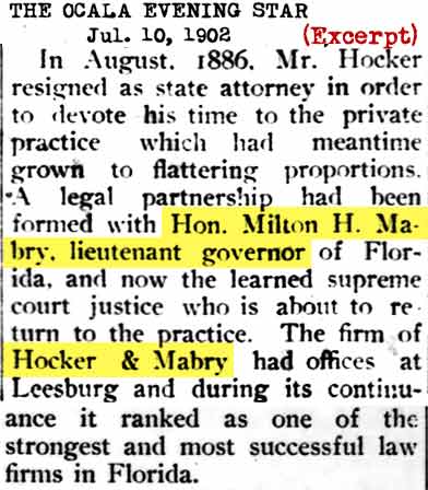 1888-10-25 The Tampa Weekly Journal 1889 At the close of his term (as Lt. Governor), Mabry turned his entire attention to his law practice in Leesburg which by an act of the 1887 legislature had become part of newly-created Lake County. With no thought of again holding public office, Mabry withdrew from the political arena to spend the remainder of his days in quiet, unostentatious retirement of a country life. (1957-04-28 The Tampa Tribune - "Pioneer Florida" by D. B. McKay, provided by Tampa historian Theodore Lesley.)