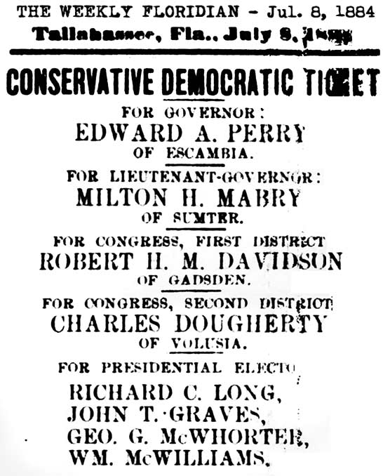 Pensacola Commercial In 1884 Milton Mabry was nominated on the first ballot at the Democrat convention in Pensacola as their candidate for lieutenant-governor. On the ticket for governor was Edward A. Perry. 1884-06-26
