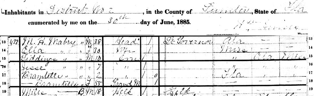 Weekly Times Union Mabry was inaugurated with Governor Perry on Jan. 7, 1885 for a four-year term. By virtue of his office, Mabry was president of the state senate presiding with dignity and rigid impartiality. The 14th governor of Florida, Edward Aylesworth Perry (March 15, 1831 – October 15, 1889) was a Confederate general who was primarily known for serving under Robert E. Lee during the American Civil War. 1885 CENSUS, SUMTER COUNTY Florida took a state census in 1885, 1925 and 1935. Milton H. Mabry, Sr. and Ella are on the 1885 Florida State Census in Sumter County with their three sons Giddings (10) and Jesse (7), and Bramlette J (this is John Bramlett Mabry) (2). Under him is listed as grandmother "Bramtelle" (55). Relationships were supposed to be to the head of house but she can't possibly be Milton's or even Ella's grandmother. The enumerator must have been thinking in relation to two year old "Bramlette" and so she would be Ella's mother, Elizabeth (Turner) Bramlett. The line before her name indicates that her first name was not recorded, so this is the enumerator's error of crossing the L instead of the two T's in Bramlett and adding an E at the end.)