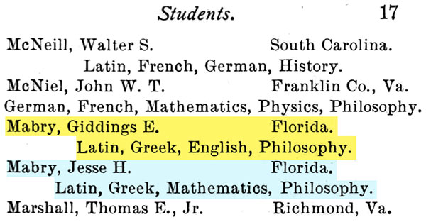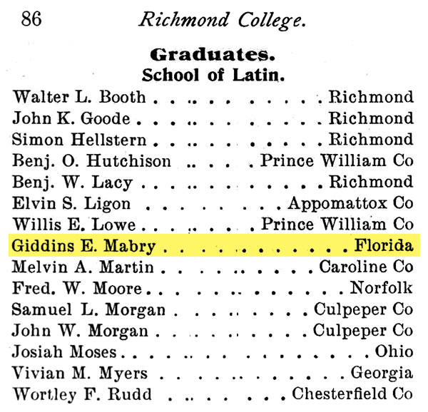 GIDDINGS MABRY'S EDUCATION Giddings Mabry was educated in the Leesburg public grade schools and Leon County High School in Tallahassee. In 1894 he entered the West Florida Seminary in Tallahassee until 1896.