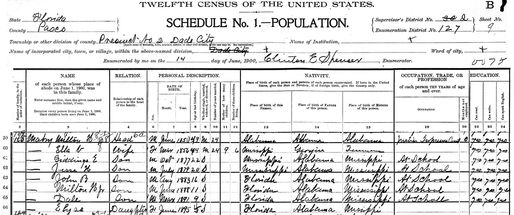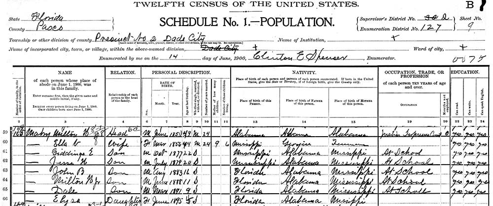 GIDDINGS MABRY RETURNS TO FLORIDA 1900 CENSUS, PASCO CO., DADE CITY
