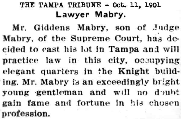 Ft Brooke was an area separate from the City of Tampa which had not yet been annexed. On the west side of downtown, the Ft. Brooke northern boundary was Whiting St. but on the east side of downtown, it extended northward to Ybor City. See The Final Battle of Fort Brooke at TampaPix. Giddings soon found himself being appointed frequently by Judge Graham to defend suspects in the criminal courts. 1901-10-18 The Tampa Tribune 1901-11-12 The Tampa Tribune In mid-February 1902, Giddings was admitted membership to the Hillsborough County Bar Association. 1902-02-09 The Tampa Tribune 1902-02-14 Tampa Tribune 1902-09-11 The Florida Times-Union GIDDINGS MABRY JOINED BY HIS FATHER, START OF MABRY & MABRY When Milton H. Mabry, Sr's service as a Florida Supreme Court justice was over, he declined re-election and moved to Tampa to join his son in the private practice of law. Giddings E. Mabry, attorney at law, became "Mabry & Mabry." 1903-01-01 The Tampa Tribune