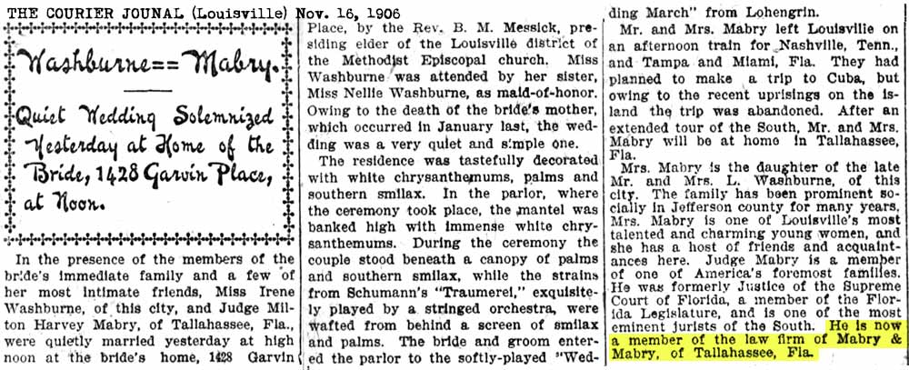 1890-07-01 Florida Times Union MABRY NOMINATED FOR SUPREME COURT JUSTICE 1890-08-13 Milton Mabry was sent as a delegate to the state Democratic convention in Ocala. Without solicitation as to himself, his name was placed in nomination for justice of the Supreme Court of Florida, and on the final ballot he received the nomination over eminent but aged incumbent, Justice Maxwell. (1957-04-28 The Tampa Tribune - "Pioneer Florida" by D. B. McKay, provided by Tampa historian Theodore Lesley.In August 1890 Mabry)