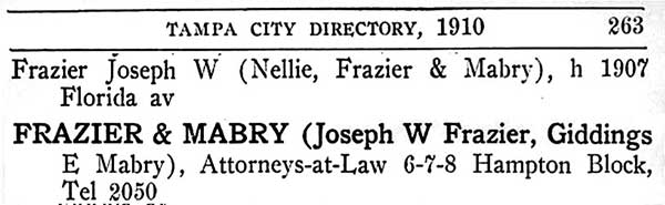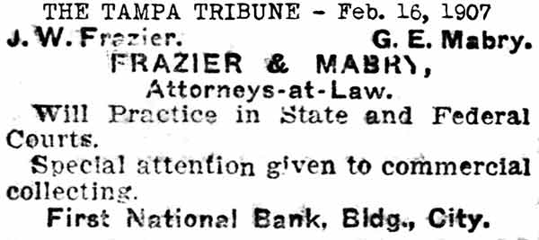 FRAZIER & MABRY PARTNERSHIP 1907-01-08 The Tampa Tribune In Jan. 1907, Giddings entered into a partnership with Joseph W. (Wheeler) Frazier as Frazier & Mabry in the First National Bank building on the 400 block of Franklin St. (the southwest corner of Franklin and Madison street.)