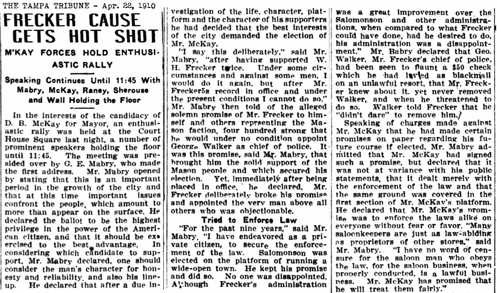 1910-02-13 The Tampa Tribune 1910-04-22 The Tampa Tribune Read about this period of Tampa political history and the friction between Donald Brenham McKay & the controversial Wm. Frecker.