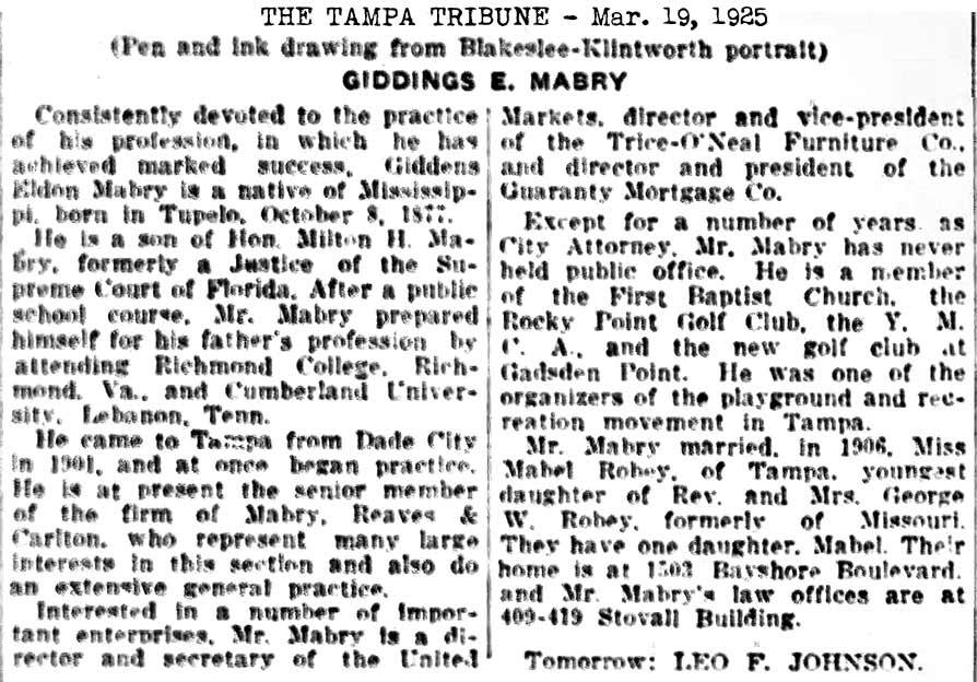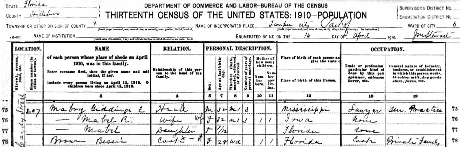 The April 1, 1910 Census in Tampa finds Giddings E. Mabry, living at 207 Cardy St. in Hyde Park, age 32, married for 3 years to 32 year old Mabel R. Mabry, Giddings's occupation was "lawyer, general practice" In their home was their 7 month old daughter, Mabel Mabry. Listed last is Bessie Brown, their cook, a 28 year old widow..
