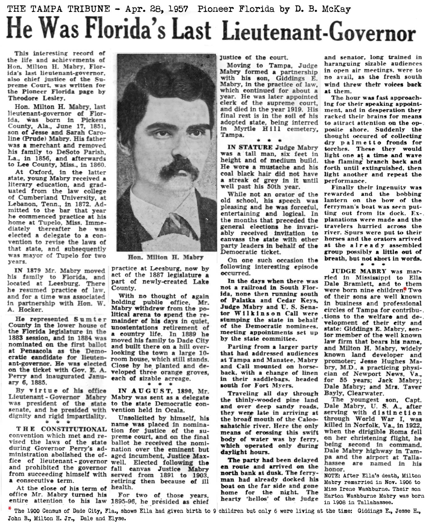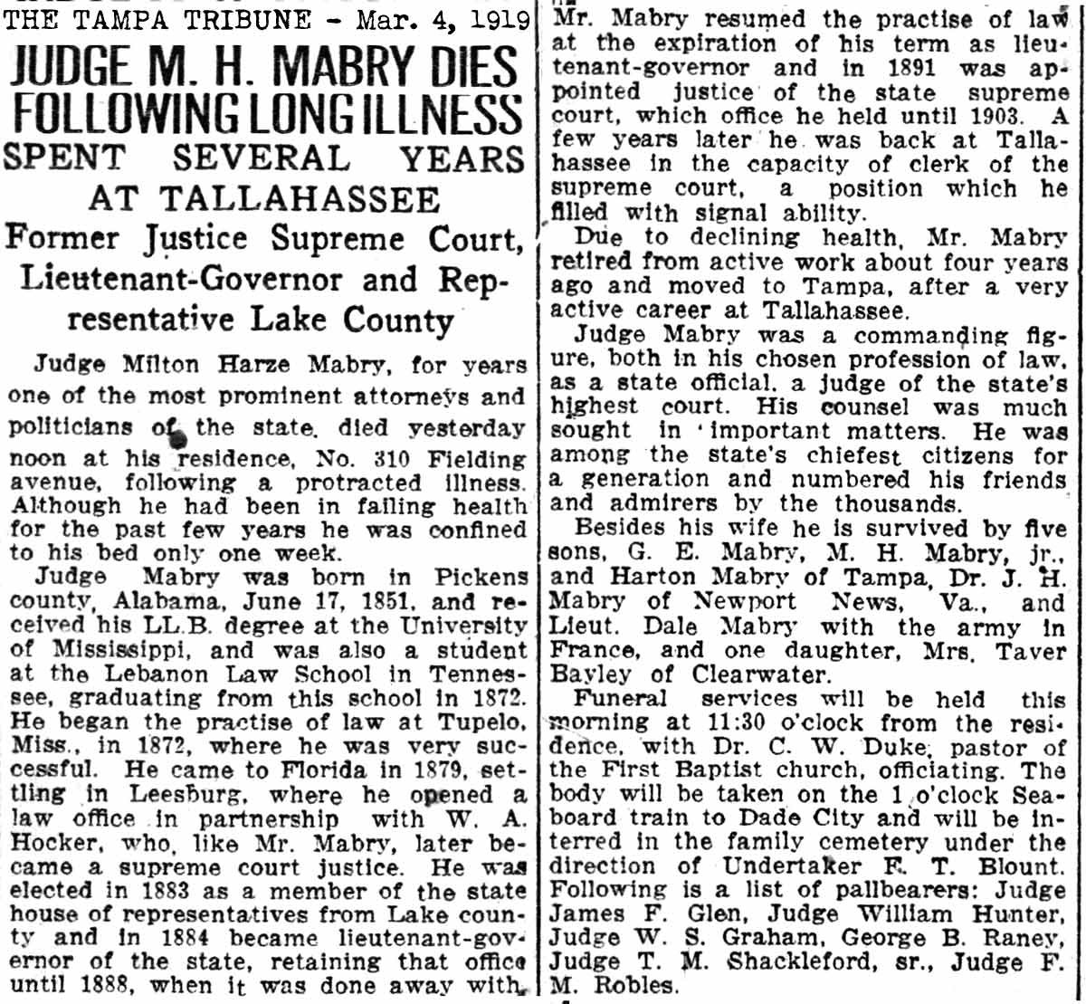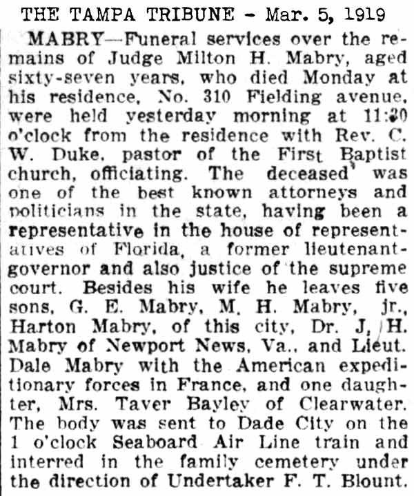 (Tallahassee) 1917-01-31 Tampa Tribune Death of Milton Harvey Mabry, Sr. 1919-03-03 Milton H. Mabry,