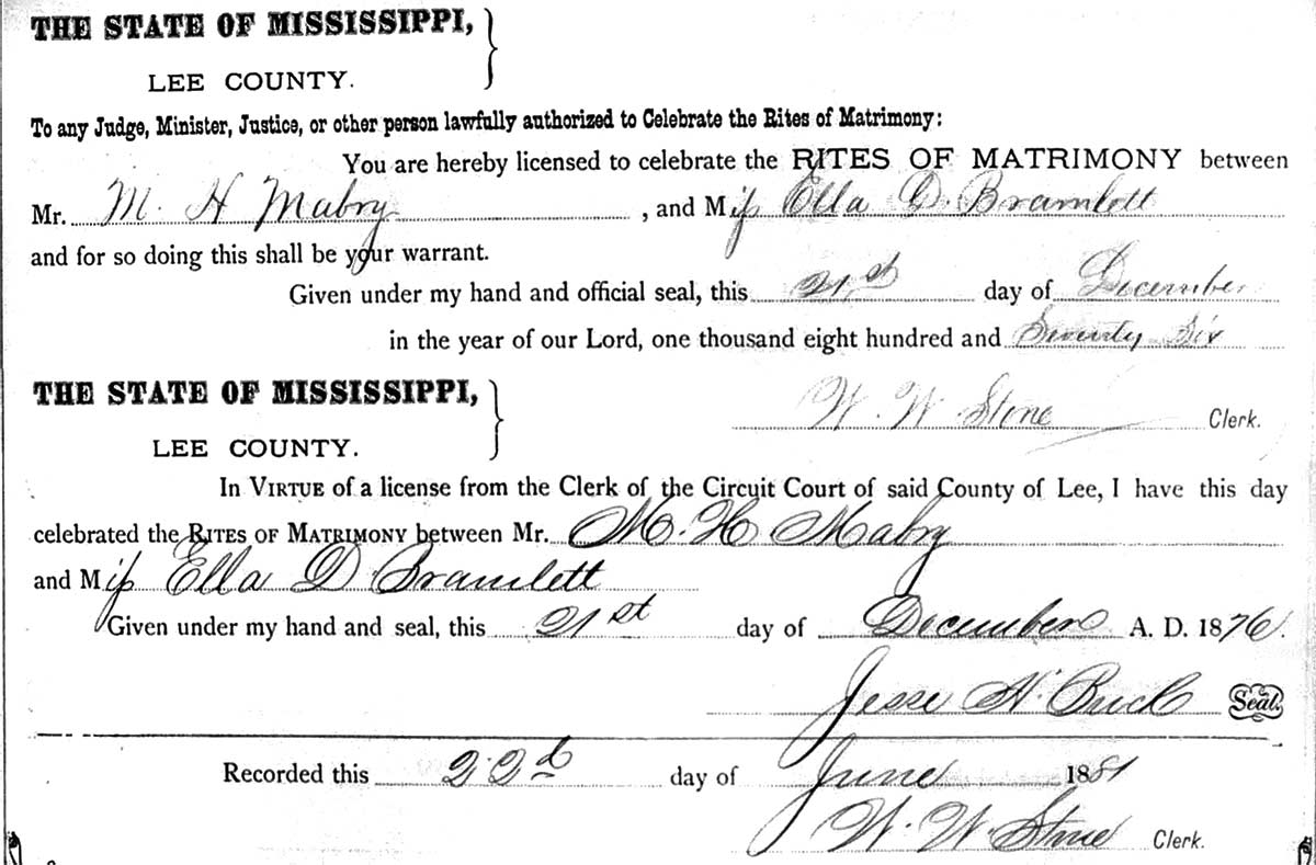 1875-01-07 The Lee County (Miss.) Clarion 1876-12-21 MARRIAGE Milton Harvey Mabry married Ella Dale Bramlett on Dec. 21, 1876 in Lee County, Miss. (Ella was b.ca.1856, in Pontotoc, Miss., a daughter of John Woodson Bramlett and Eliza G. Turner Bramlett).