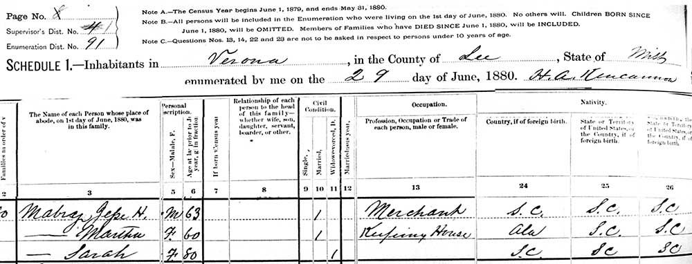 1880 - JESSE MABRY & WIFE MARTHA No record or news article has been located concerning the death of John Mayberry Mabry. (TampaPix has little confidence that his middle name was Mayberry.) By the time of the 1880 Census, Jesse's mother, widowed Sarah Hughes Mabry, was living with Jesse and his wife Martha. Sarah Hughes Mabry was born 19 December 1801 died on 24 January 1881 in Verona, Lee County, Mississippi.